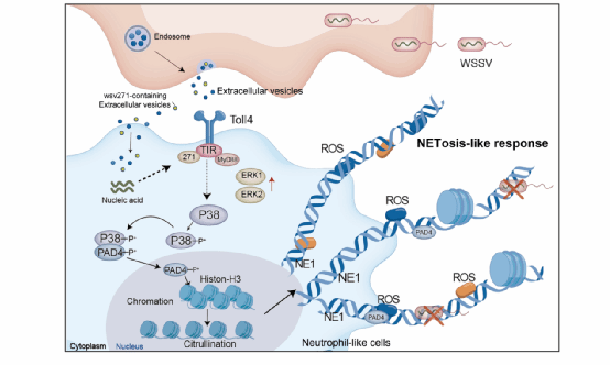对细胞外囊泡(EVs)进行转录组测序发现,青蟹被病毒感染后血细胞EVs可特异性包裹病毒核酸wsv271,该核酸在受体细胞中被翻译成病毒蛋白,并与Toll4的TIR结构域互作,招募MyD88激活P38-MAPK级联反应。这种信号转导进一步引起PAD4蛋白磷酸化和核转位,介导组蛋白-H3瓜氨酸化修饰,并驱动类中性粒细胞释放胞外诱捕网以及NETosis现象的发生。研究结果揭示了一种依赖EVs介导的NETosis激活机制,这是一种全新的抗病毒策略,即病原体来源的核酸劫持外泌体来激活先天免疫。