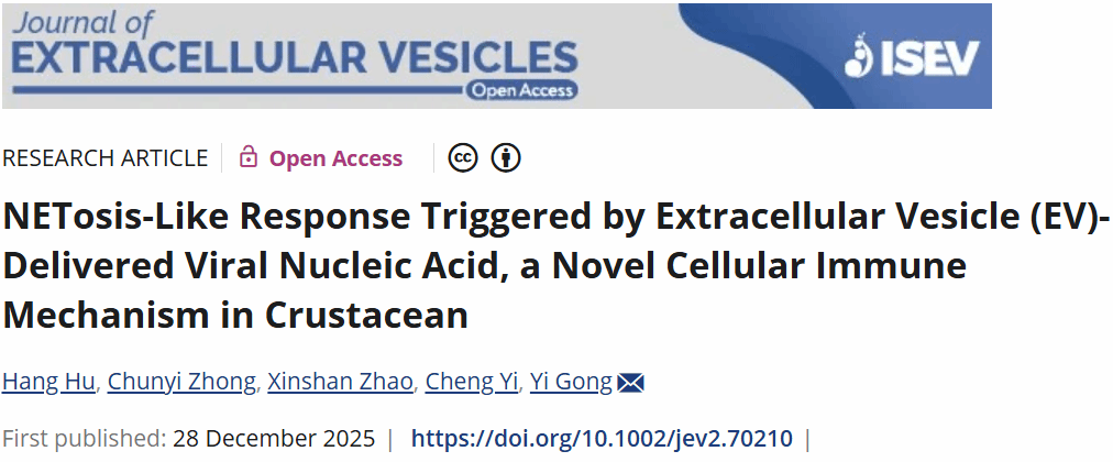 近日,我校生命科学学院龚燚教授课题组在甲壳类免疫方面取得重要进展,相关成果以“NETosis-Like Response Triggered by Extracellular Vesicle (EV)-Delivered Viral Nucleic Acid, a Novel Cellular Immune Mechanism in Crustacean”为题发表在Journal of Extracellular Vesicles上(国际细胞外囊泡学会ISEV会刊,IF=14.5),这是该期刊发表的首篇水产动物研究论文,南昌大学为唯一完成单位。