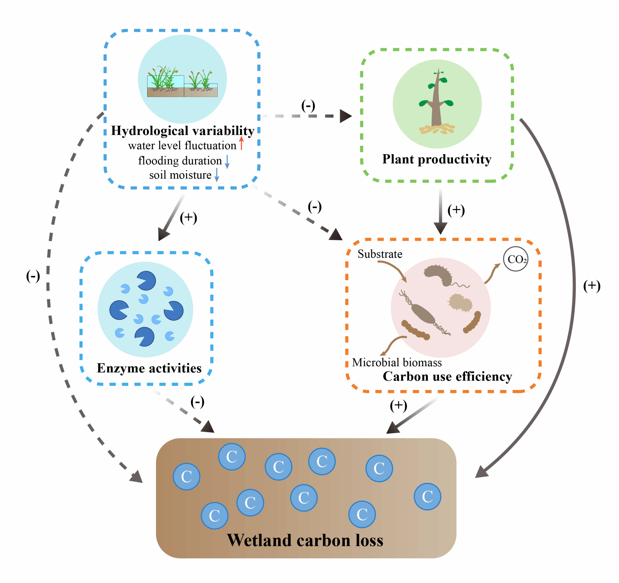 本研究首次在自然湿地生态系统中提供了坚实的长期实证:水文条件是调控土壤有机碳动态的首要驱动因子。研究发现,淹没时间缩短、水位波动加剧以及土壤趋于干燥等水文情势变化,显著加速了湿地土壤碳库的流失。这一过程并非直接作用,而是通过“植物–微生物”耦合路径间接实现,其中,微生物碳利用效率与氧化酶活性作为关键中介因子,连接了水文扰动与碳循环响应。此外,研究识别出中高程区域为碳损失的“热点地带”,对水文变化表现出高度敏感性,微小的水文扰动即可引发显著的碳释放。