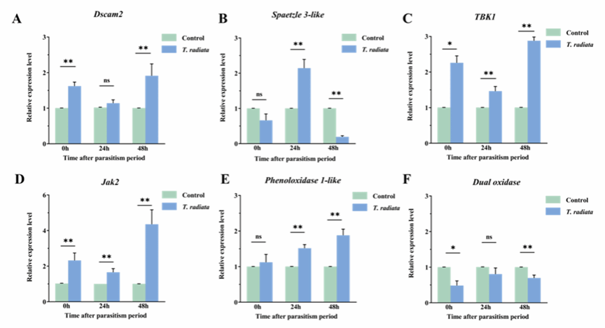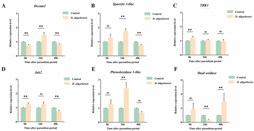 Detection of the expression of immunity-related genes in the Imd, JAK/STAT, Toll, and PO pathways of D. citri after parasitism showed that both parasitoid wasp species significantly affected these pathways, but the magnitude and temporality of the effects differed. At 24 and 48 hours after parasitism by Tamarixia radiata, the immune genes of D. citri remained significantly affected; whereas at 48 hours after parasitism by D. aligarhensis, the expression levels of the relevant genes in D. citri had returned to basal levels or were slightly downregulated. These findings supplement our understanding of the mechanisms underlying the cellular and humoral immunity of D. citri and fill the gaps in the research on the interaction mechanisms between the immune systems of D. citri and its parasitoid wasps.
