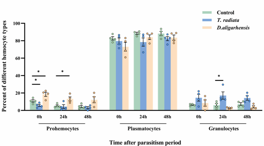 Parasitoid wasps are classified into endoparasitoids and ectoparasitoids based on their parasitic modes. Endoparasitoids lay eggs inside the host's body, where the larvae hatch and feed on the host's internal tissues and hemolymph for development. In contrast, ectoparasitoids deposit their eggs on the host's surface, with larvae feeding on nutrients externally. Parasitoid wasps regulate hosts through multiple mechanisms, including manipulating the host's immune response to ensure successful parasitism and the normal development of their offspring, ultimately leading to the death of the host pest and effective control of the pest population. Tamarixia radiata (an ectoparasitoid) and Diaphorencyrtus aligarhensis (an endoparasitoid) are key components of biological control for D. citri. They can effectively suppress D. citri populations in natural environments and show considerable promise for practical application. Nevertheless, there have been no previous reports on the effects of these two parasitoid wasp species on the immune response of D. citri.