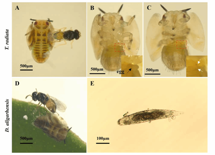 Figure 1: Parasitism of D. citri nymph by T. radiata or D. aligarhensis.