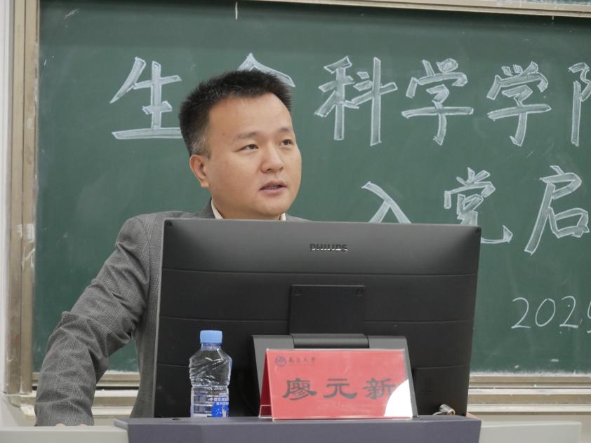 为扎实推进新生入党启蒙教育工作,积极引导2025级新生向党组织靠拢,深化对党的认识与认同,11月5日晚,生命科学学院在外经楼204举办2025级新生入党启蒙教育讲座。本次活动邀请南昌大学团委书记廖元新老师担任主讲嘉宾,以《我命由我不由天——大学生入党教育启蒙》为题作专题报告,学院全体2025级新生到场聆听。
