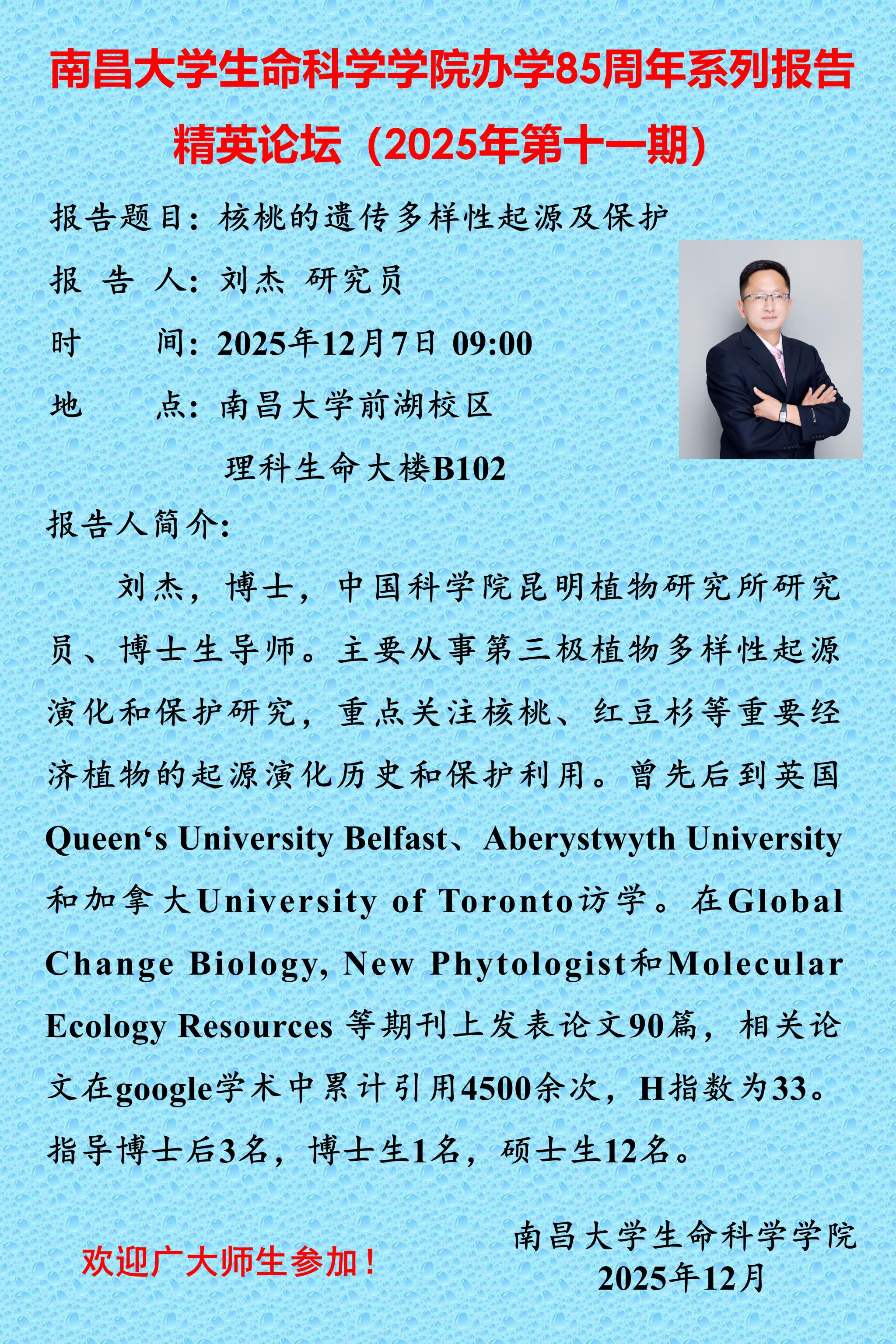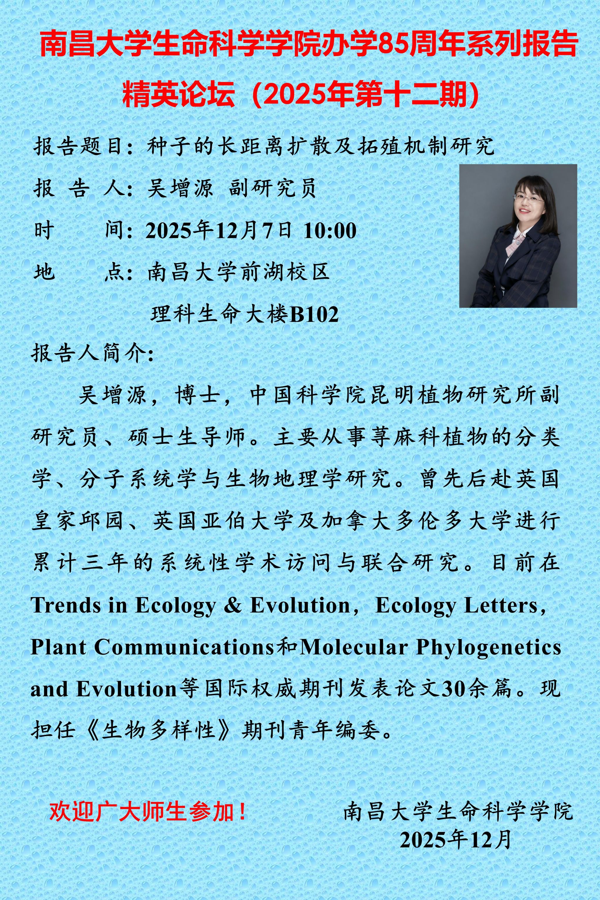 2025-12-08生命科学学院举行教学教研示范与交流活动 ——“植物分类学野外实习”思政模式受关注生命科学学院举行教学教研示范与交流活动——“植物分类学野外实习”思政模式受关注2025年12月4日下午,我院在基础实验大楼A1区大会议室举行国家级课程思政示范课——《井冈山生物学野外综合实践》教学教研示范与交流活动。教学研讨会由学院副院长王尚洪主持,全院70余位专任教师参与。 课程思政示范教学名师刘以珍老师以《植物分类学野外实习——实践驱动,思专融合的思政育人模式》为题,分享“AI识花+三色思政”课程思政教学改革经验。...