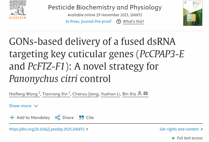 2025-12-08RNA干扰农药 · 创新绿色防控技术 ——生物灾害与安全团队开辟柑橘全爪螨表皮发育关键调控轴(PcFTZ-F1 → PcCPAP3-E )RNAi防控新路径RNA干扰农药 · 创新绿色防控技术——生物灾害与安全团队开辟柑橘全爪螨表皮发育关键调控轴(PcFTZ-F1 → PcCPAP3-E )RNAi防控新路径 柑橘是我国南方最主要的水果,柑橘全爪螨( Panonychus citri )俗称柑橘红蜘蛛,是柑橘类最主要害虫,严重影响柑橘产业发展。长期、大量使用化学农药防治柑橘全爪螨,抗性、残留问题突出,并造成严重农业面源污染,寻找新的绿色防控技术显得尤为迫切。近日,南昌大学生命科学学院生物灾害与安全团队在《...