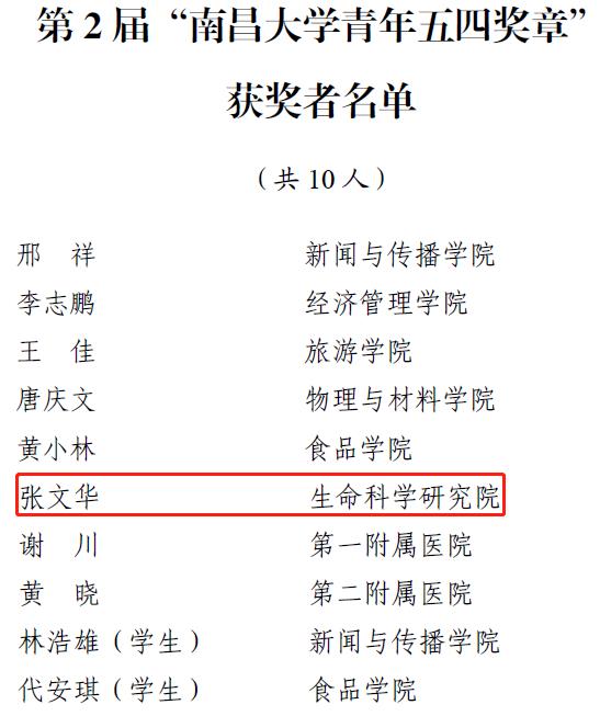 过去一年,学校青年师生以服务学校世界一流大学建设大局和青年成长成才为宗旨,在各领域都取得了突出业绩,同时涌现出了一大批先进典型。为深入学习贯彻习近平新时代中国特色社会主义思想和党的二十大精神,落实习近平总书记关于青年工作的重要思想,进一步激励广大青年师生发挥青年典型模范作用,踔厉奋发、笃行不怠,全方位助力“六个江西”“五个南大”建设,争做堪当民族复兴重任的时代新人,经个人申报、各单位择优推荐、组织资格审查、组织专家评审环节,南昌大学决定授予10名同志第2届“南昌大学青年五四奖章”称号,经生命科学研究院党支部推荐,张文华老师名列其中;决定授予21名同志2022 年度南昌大学“青年岗位能手”称号,学院张万昌老师名列其中。