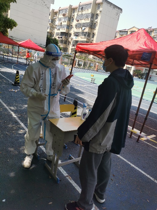 支部书记邹志文同志自疫情发生后五次参加志愿者活动,参与检测人员引导、上门核酸检测以及在核酸检测点进行信息录入等活动