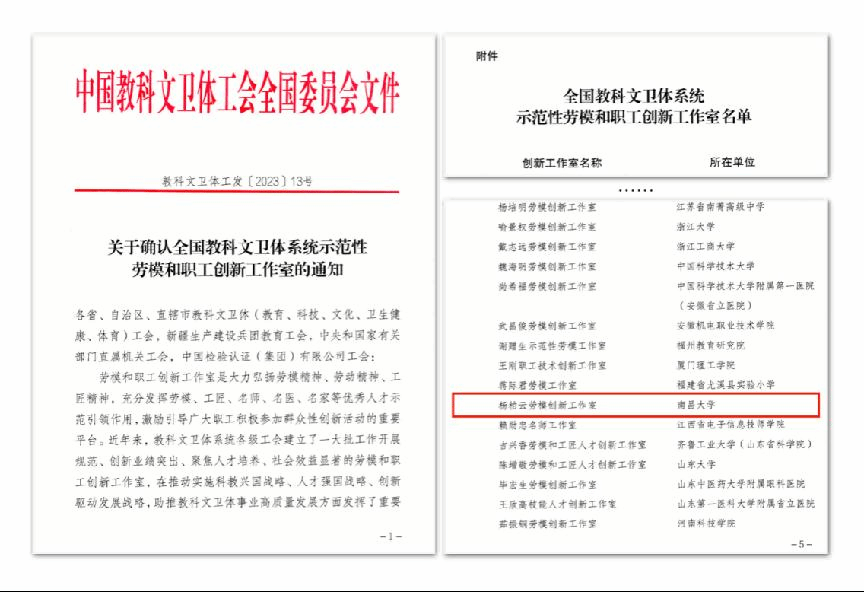 近日,中国教育工会南昌大学委员会发出喜报,经过推荐、审核、公示等程序,中国教科文卫体工会选树了一批全国教科文卫体系统示范性劳模和职工创新工作室,我院杨柏云劳模创新工作室成功入选。