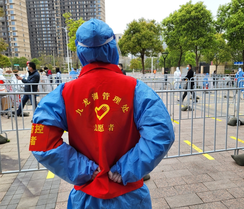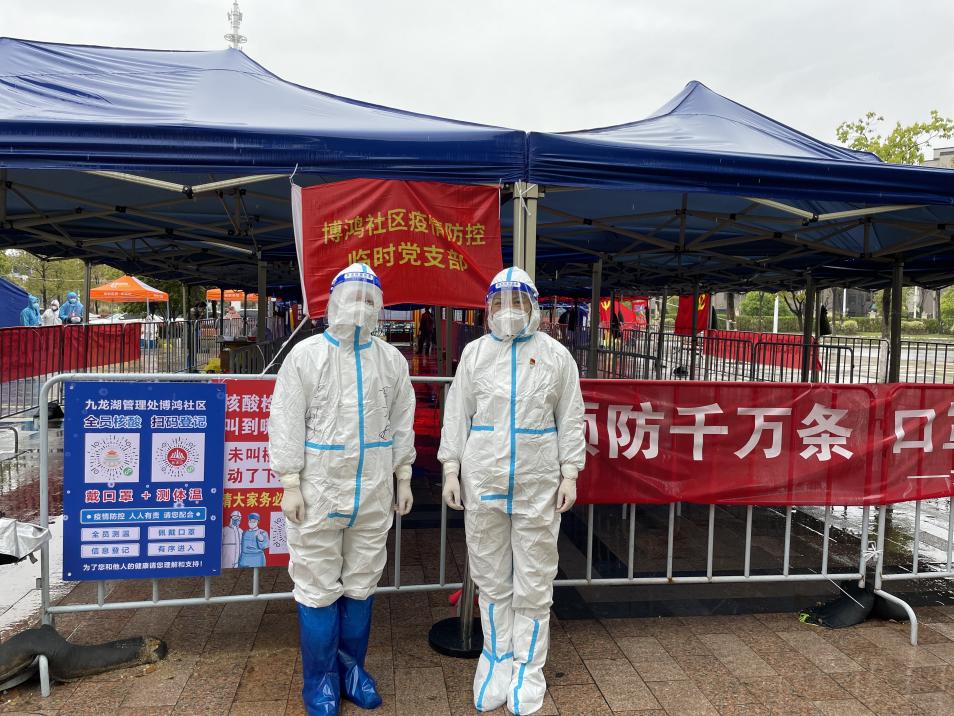 胡蓓娟老师联系了所在社区,当天晚上23点多第一轮核酸检测结束后,拉起了一个只有7个人的社区志愿者服务群。第二天一早6点半上岗,协助社区开展第二轮核酸检测工作,主要工作是维护秩序、引导居民、帮助使用“昌通码”等,虽然物资和人员方面都尚有欠缺,但整个过程都井然有序,同时还为老人、孕妇和儿童开通了快速检测通道。当看到各位邻居排队时纷纷互相提醒保持距离,看到大家互相谦让、有礼,听到大家都微笑着说你们辛苦了,觉得这一切都很值得!