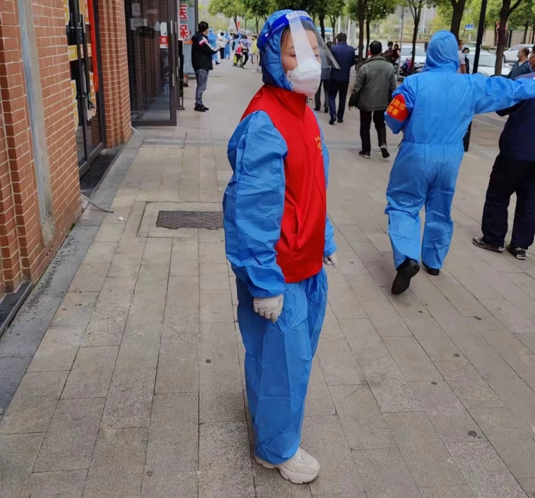 在短短12天的时间里,所在社区先后进行了7次核酸检测。最后3次检测因为连续工作三天导致人手严重不足,胡蓓娟主动接起了样品打包员的工作,从“小蓝”变成了“大白”。从最早到岗到最后离岗,感受着医务人员和社区工作者的艰辛,当又一次完成了超4000人次的检测,当最后一批样品从她手中被转接时,大家都互相说着辛苦了,今晚可以好好睡一觉了。她还惦记着今天从社区书记那里领到的党徽,佩戴着它和同为党员志愿者的邻居一起相约到临时党支部的党旗下拍了一张合影,作为这段时间的一个纪念。