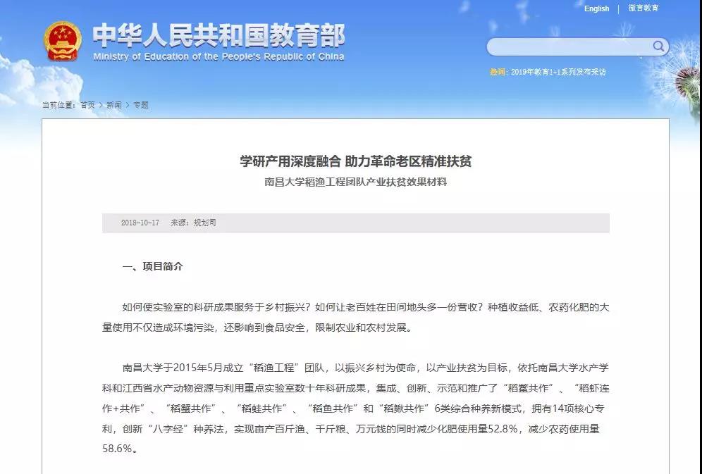 特别是在稻渔综合种养健康养殖技术的示范与推广工作中,洪一江教授作为南昌大学稻渔工程团队的负责人,带领团队师生在田间地头开展技术培训超过50次,总受益人群超过5000人次。以“政府+项目团队(公司)+龙头企业+专业合作社+贫困户”的运作模式,帮助19家省内龙头企业实现经济效益3-5倍的巨大提升,合作企业年产总值超10亿。
