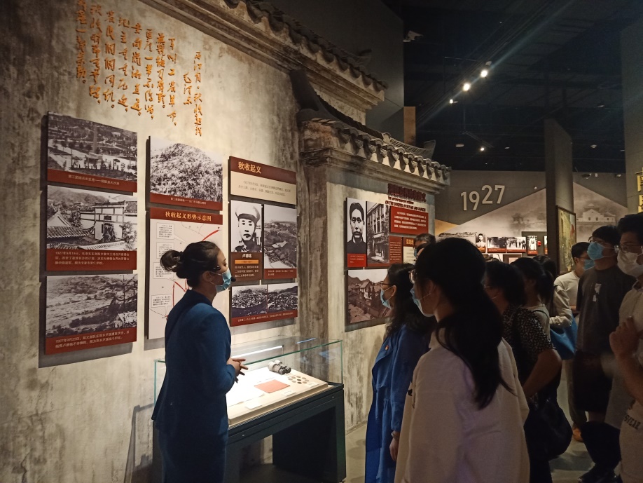 师生们跟随着讲解员一一回顾了老一辈无产阶级革命家在江西这块红色土地上,演绎的一系列波澜壮阔的英雄史诗:安源路矿工人大罢工震惊中外,南昌起义打响武装反抗国民党反动派第一枪,创建井冈山革命根据地,建立中华苏维埃共和国临时中央政府,两万五千里长征从这里出发,三年艰苦卓绝的游击战争,孕育了伟大的井冈山精神、苏区精神和长征精神。