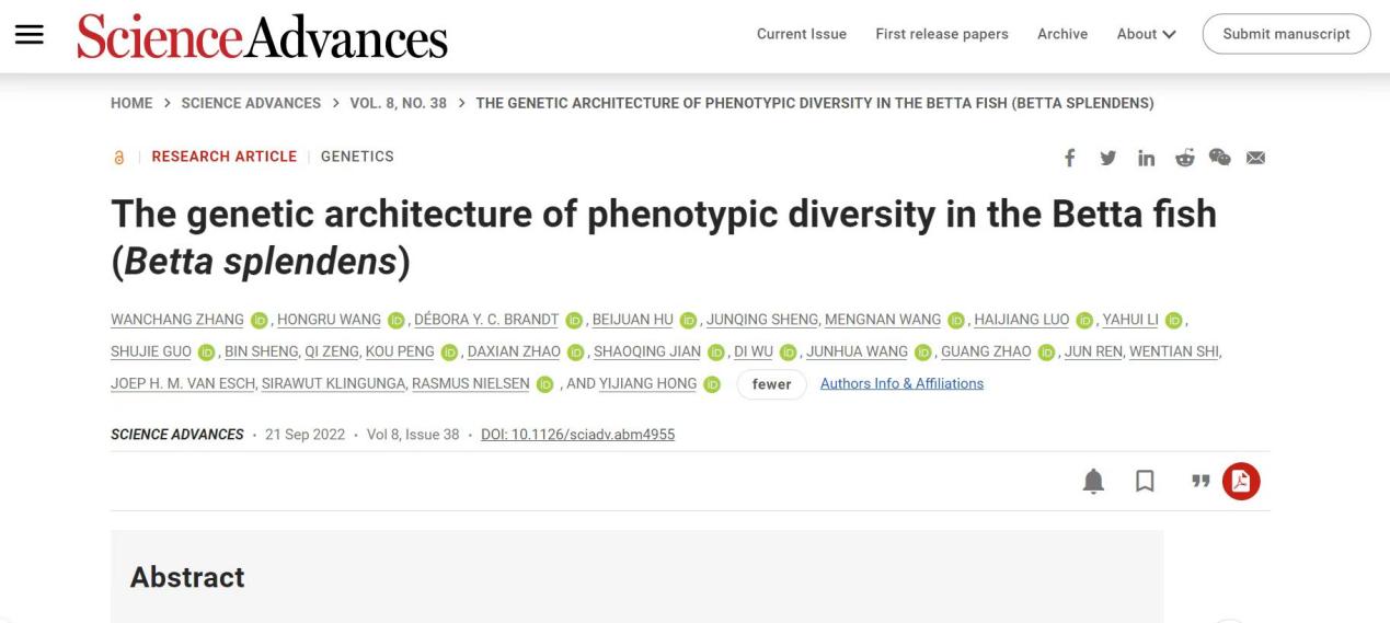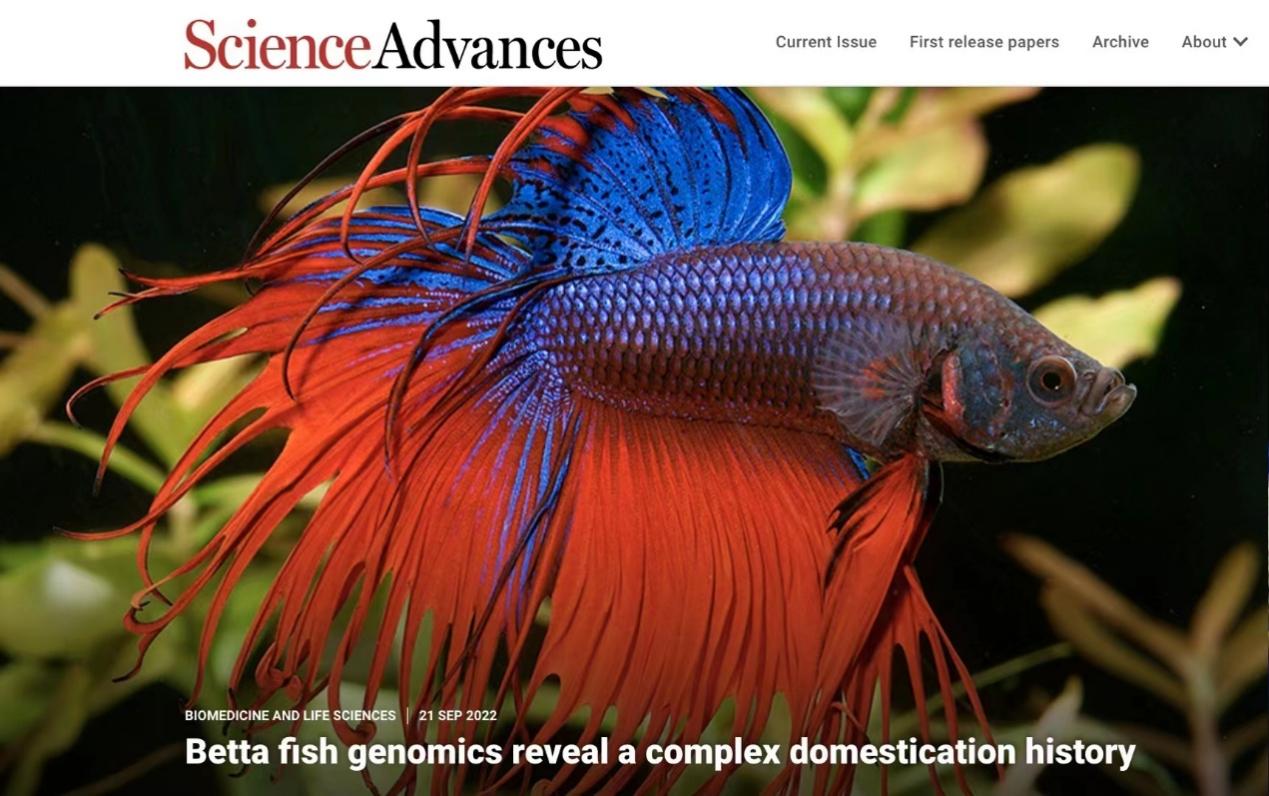 2022年9月22日,南昌大学生命科学学院洪一江教授团队在Science Advances发表题为“The genetic architecture of phenotypic diversity in the Betta fish (Betta splendens)”的重要研究论文。该项工作历时5年,主要围绕风靡全球的一种小型观赏鱼—暹罗斗鱼,通过开展群体遗传学与全基因组关联分析阐明了暹罗斗鱼复杂的驯化历史和表型多样性的遗传基础。本论文在预印版一经发表之后,就受到行业内广泛关注,相继受到The Scientist、The Atlantic等国际科技媒体采访与报道。