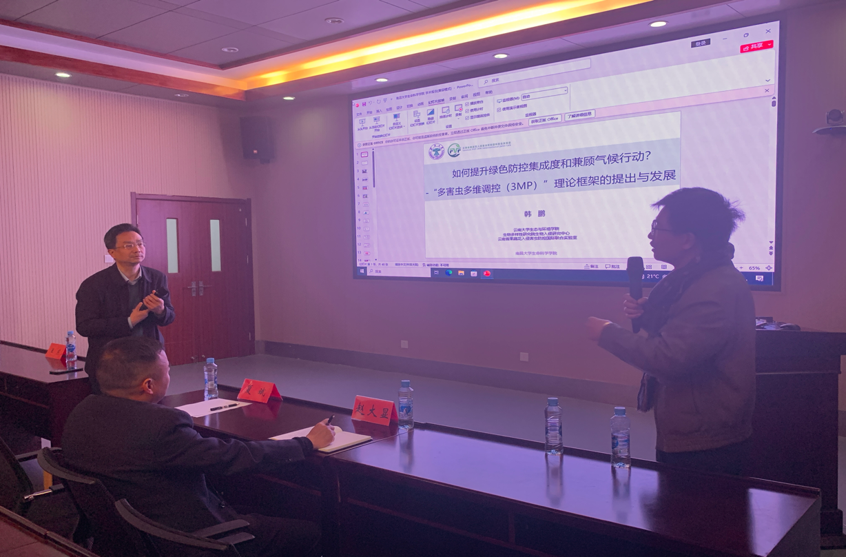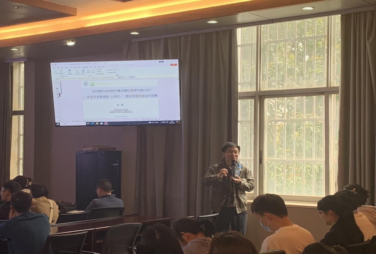 韩鹏教授为参会师生们带来了一场题为“如何在绿色植保实践中兼顾气候行动?多病虫多维调控(3MP)理论框架的提出与发展”的精彩学术讲座。韩教授围绕为什么农业病虫害绿色防控技术应用成本居高不下,最终导致“叫好不叫座”?以及有哪些缓解和适应气候变化的农业措施恰好能在IPM中发挥重要作用?—当前农业系统IPM应用的两大现实问题,在讲座中系统阐述了多病虫多维调控(3MP)的创新理论框架,解释了缓解和适应气候变化的农业措施产生的"bottom-up"效应在害虫防控中的作用,以及这种效应如何与“top-down”效应发生交互作用。