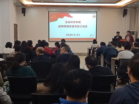 为了进一步加强教师队伍建设,提高教师自身修养,弘扬师德师风,树立教师形象,引导广大教师争做“有理想信念、有道德情操、有扎实学识、有仁爱之心”的好老师,增强每一位教师的荣誉感、使命感和责任感,并庆祝第三十六个教师节,9月23日下午,生命科学学院于衰老所一楼会议室召开全院教职工大会,并举行了教师师德承诺书签订活动。