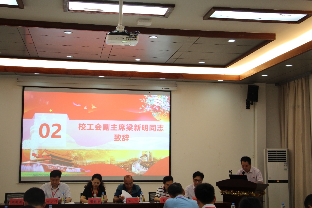 随后,校工会副主席梁新明同志致辞,他代表学校工会对本次大会的召开表示祝贺,并预祝本次大会圆满成功。