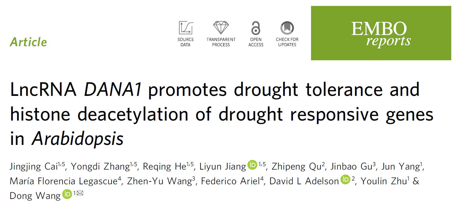 2024年1月2日,EMBO reports在线发表了南昌大学王东教授团队题为“LncRNA DANA1 promotes drought tolerance and histone deacetylation of drought responsive genes in Arabidopsis”的研究论文,该研究系统解析了长链非编码RNA DANA1调控拟南芥响应干旱胁迫的分子机理。