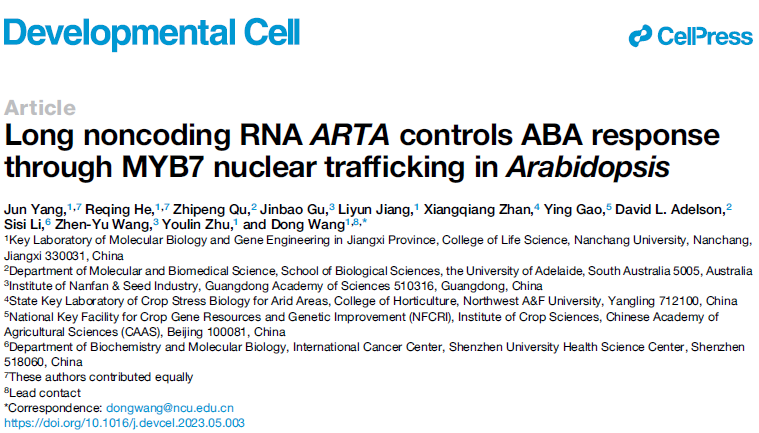 2023年6月7日,王东团队在Cell子刊《Developmental Cell》发表了题为“Long noncoding RNA ARTA controls ABA response through MYB7 nuclear trafficking in Arabidopsis”的研究论文。杨俊博士和贺热情博士为共同第一作者,王东教授为通讯作者,南昌大学生命科学学院为第一作者单位。