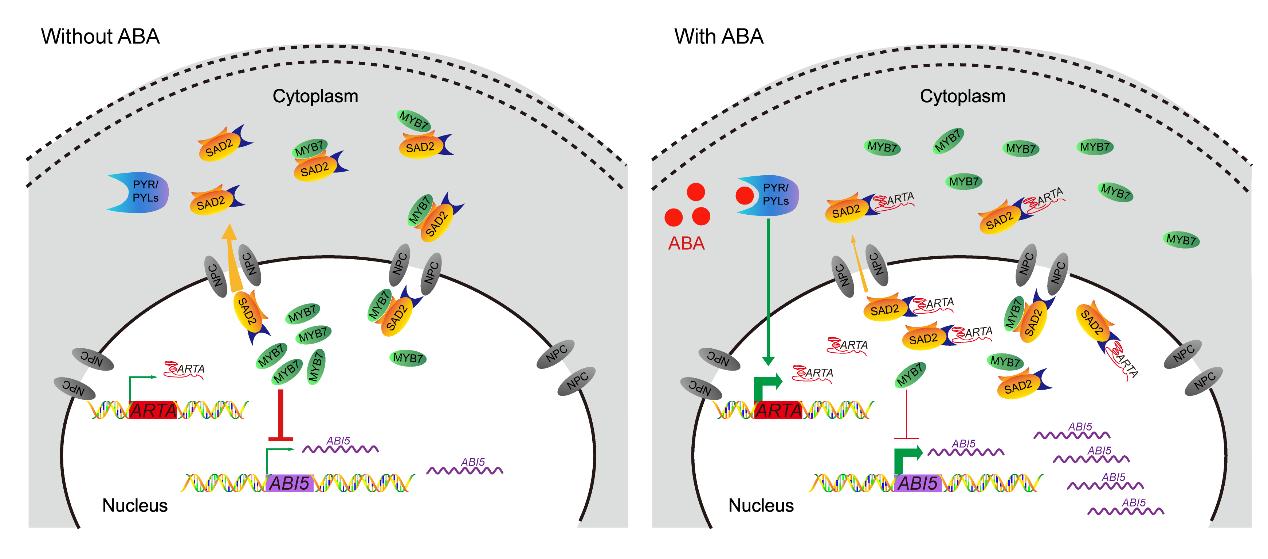 该研究结果表明,当植物在正常生长条件下,MYB7通过结合SAD2且被其转运进入细胞核,从而抑制ABI5的表达。然而,在ABA处理或干旱胁迫的条件下,ARTA转录水平上调,其转录本与细胞核中SAD2结合,导致MYB7与SAD2互作被破坏,进而使SAD2转运MYB7入核受阻,解除了MYB7对ABI5表达的抑制作用,使得ABI5表达上调。这一发现揭示了长链非编码RNA作为转录因子入核调节因子影响植物ABA应答的新功能,丰富了长链非编码RNA的功能与作用机制。相关论文信息:https://doi.org/10.1016/j.devcel.2023.05.003。