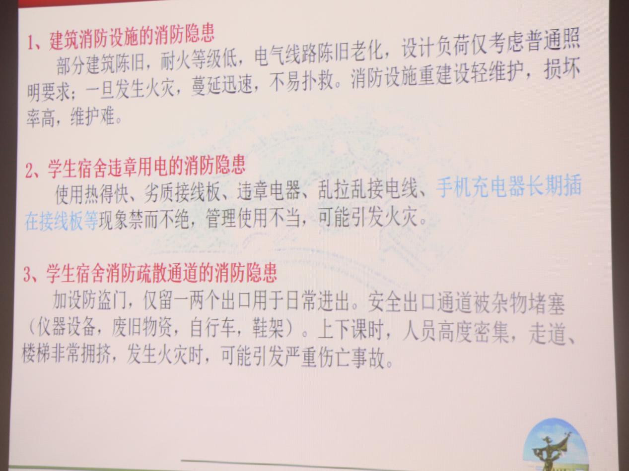 生活中我们该如何预防火灾?遇到火灾应该如何处理?平时应该关注什么以最大限度保证发生火灾时能成功逃生?消防安全教育讲座就每一个有关消防的知识、技能细细展开,提高了同学们的消防安全意识,给同学们的生命安全提供最大的保障。