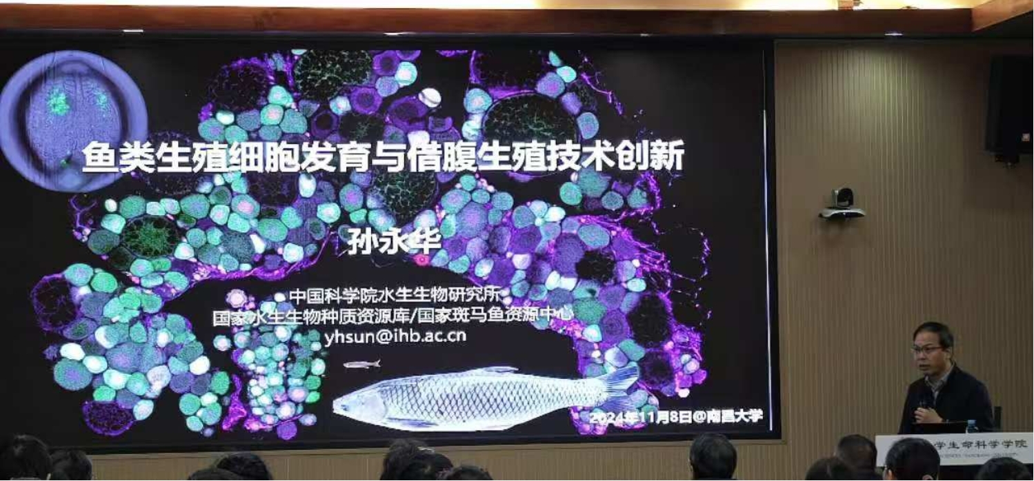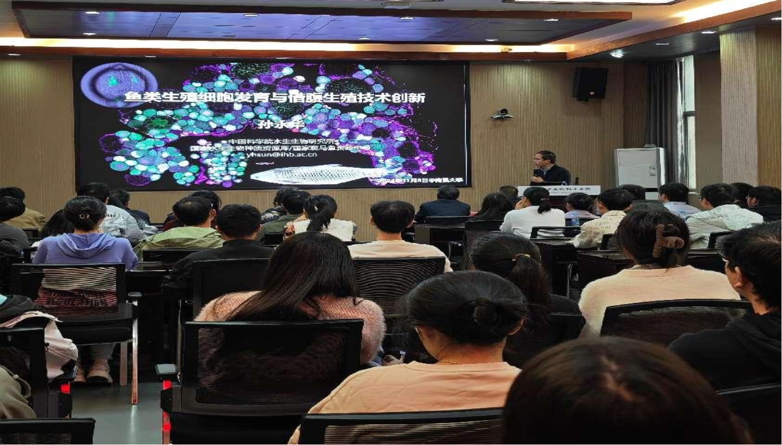 孙永华研究员以“鱼类生殖细胞发育与借腹生殖技术创新”为题,向与会师生分享了他们团队在鱼类生殖细胞发育的相关研究。报告开始,孙永华研究员强调了鱼类等水产品是重要和优质的动物蛋白来源。接着引出了可持续发展水产养殖面临的问题:繁育困难,卵质不齐;周期漫长,苗种短缺;品种退化,病害频发。孙永华研究员指出了解决这些问题的关键以及水产遗传育种的未来发展趋势,未来,发展创新性的生物技术——如基因编辑和“借腹生殖”,将大大加快水产养殖的遗传改良。