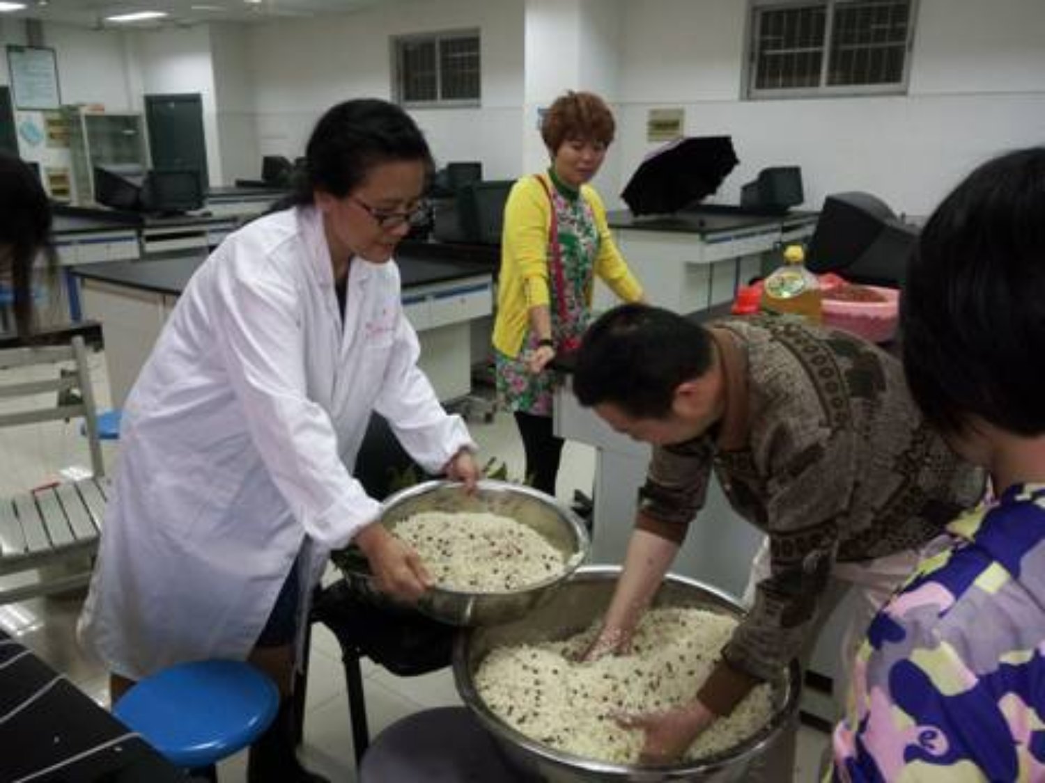 活动当天,在院工会组织下,实验中心的老师为大家提供了包粽子的蜜枣、糯米等食材;许多没有课的老师来到现场有的学、有的包;生命科学学院党委书记蔡磊、副院长万丽丽也和老师们一起乐于其中。