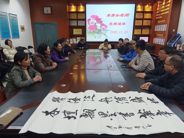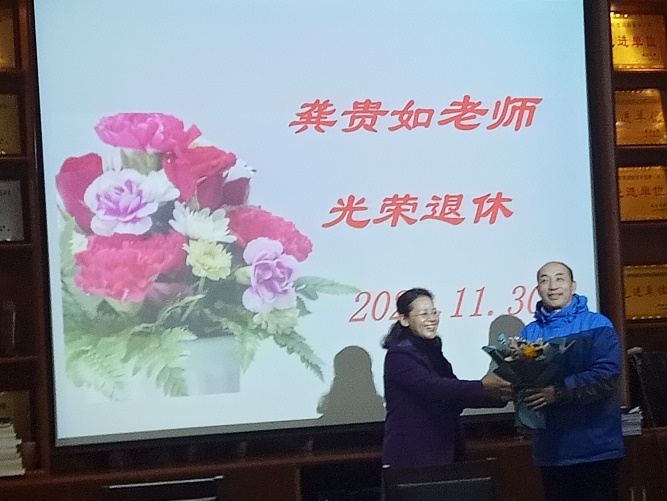 此次座谈会主要是庆贺学院生物学基础实验中心龚贵如老师光荣退休,余潮副主任介绍并回顾了龚贵如老师兢兢业业的工作历程,高度赞扬了他在工作岗位上做出的突出贡献。随后,谢春华书记和学院工会副主席薛喜文向龚贵如老师献花并赠送了纪念品,大家进行了合影留念。