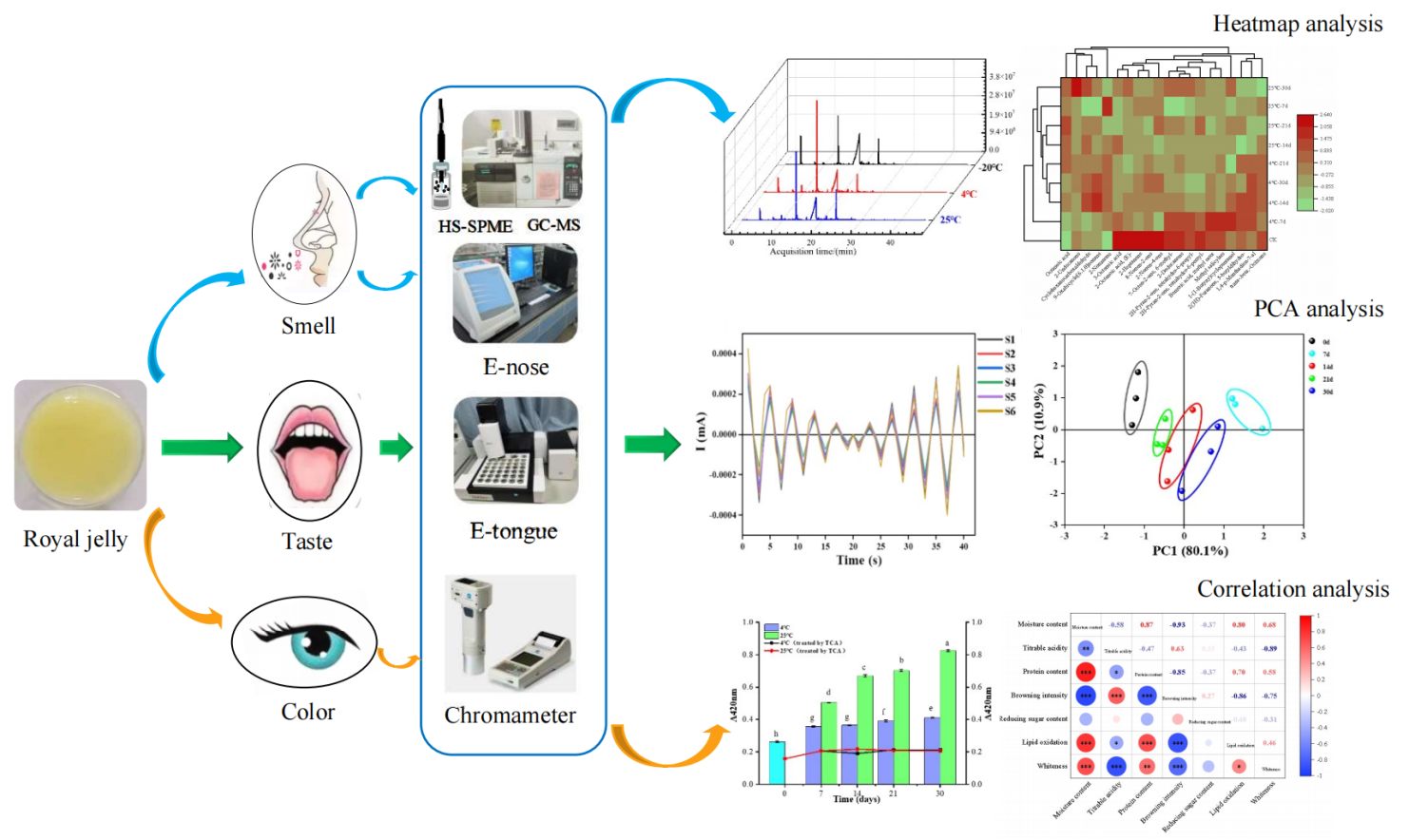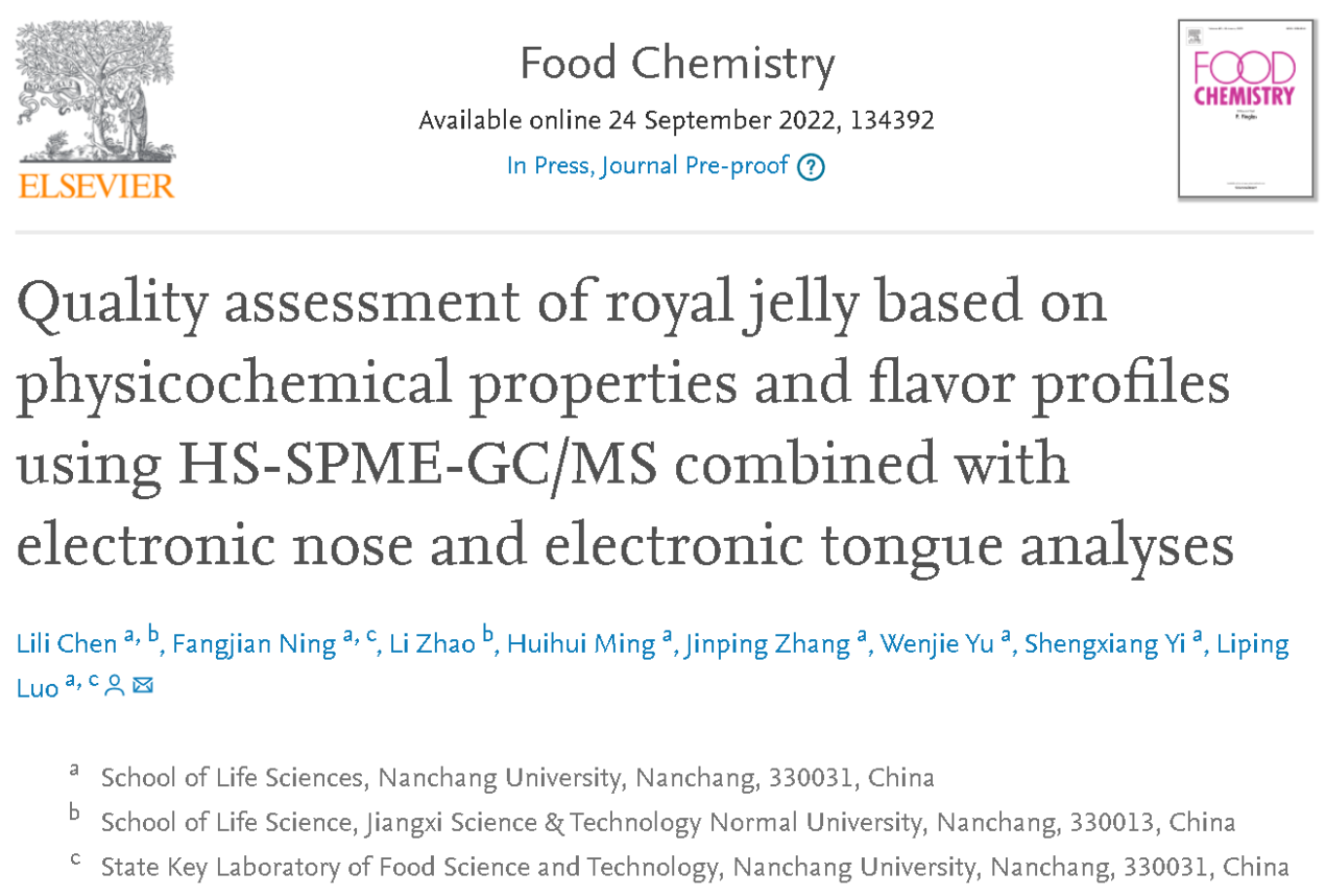 近日,南昌大学生命科学学院罗丽萍教授团队在农林科学领域Top期刊Food Chemistry在线发表题为“Quality assessment of royal jelly based on physicochemical properties and flavor profiles using HS-SPME-GC/MS combined with electronic nose and electronic tongue analyses”的研究论文。