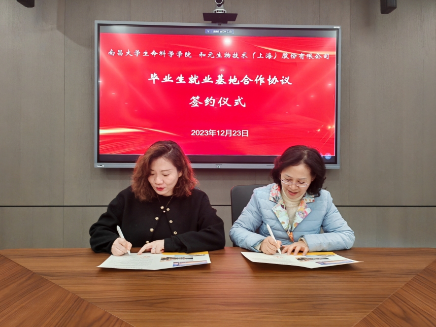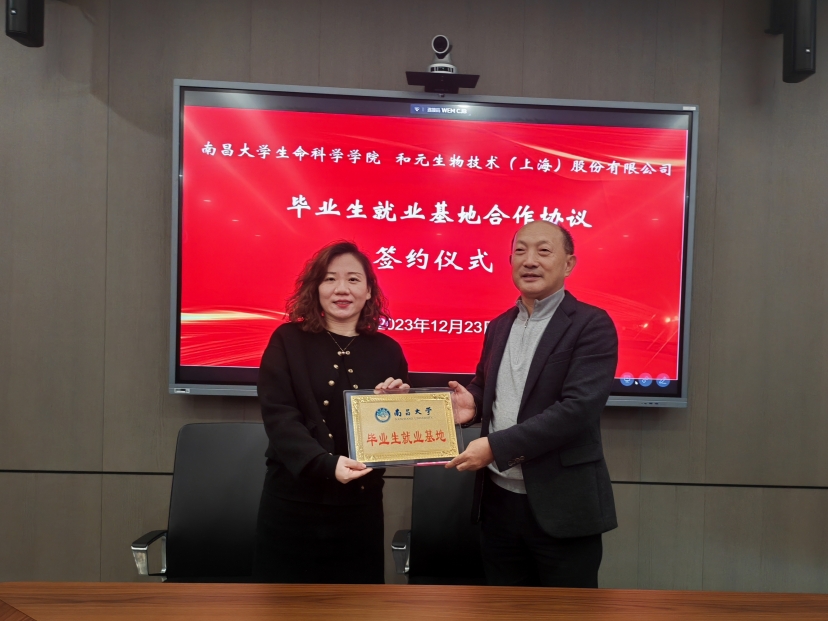 12月23日上午,一行人参观了和元生物技术(上海)股份有限公司的展厅和技术服务平台,随后进行了座谈。座谈会上,副总经理殷珊(2004届生物科学专业毕业生)介绍了和元的发展历程、业务范围、未来规划等情况,人力资源负责人王晓波介绍了公司人才需求等情况,葛刚副校长介绍了南昌大学的历史沿革、人才培养、发展目标等情况,并对企业愿景和经营理念表示高度认同,希望校友们积极为母校发展献计献策,在人才培养、社会服务、招生就业等方面为母校提供大力支持和帮助。随后,双方围绕企业现状、人才培养、校企合作、发展路径和合作意向等方面进行了深入探讨。最后,双方签订了毕业生就业基地协议,并进行了授牌仪式。