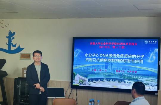2025年4月24日,南昌大学生命科学学院85周年系列报告知行论坛(第十三期)在南昌大学前湖校区理科生命大楼A212职工之家顺利举行。本次论坛由学院副院长赵大显教授主持,徐小文讲师担任主讲人,进行主题为“小分子Z-DNA激活免疫反应的分子机制及抗病免疫制剂的研发与应用”的报告,吸引了相关领域的师生前来。