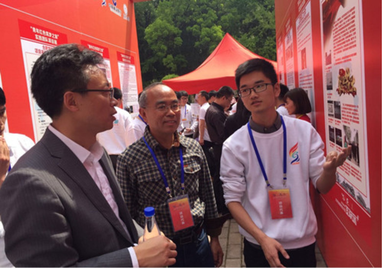 启动仪式后,在“青年红色筑梦之旅”团队的展台区,教育部高教司理工处吴爱华处长在我院项目展板前询问项目情况,金峰同学详细介绍了项目团队在江西省的实施开展和扶贫落地进展。吴爱华处长对项目的成效表示了肯定并提出宝贵的意见。