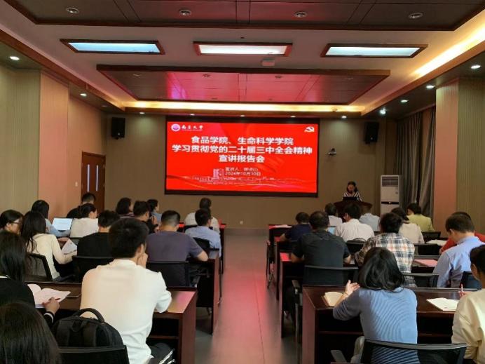 10月10日下午生命科学学院联合食品学院举行了学习贯彻党的二十届三中全会精神宣讲报告会。会议由生命科学学院党委书记谢春华主持,学校专家宣讲团钟贞山教授为师生们进行宣讲。
