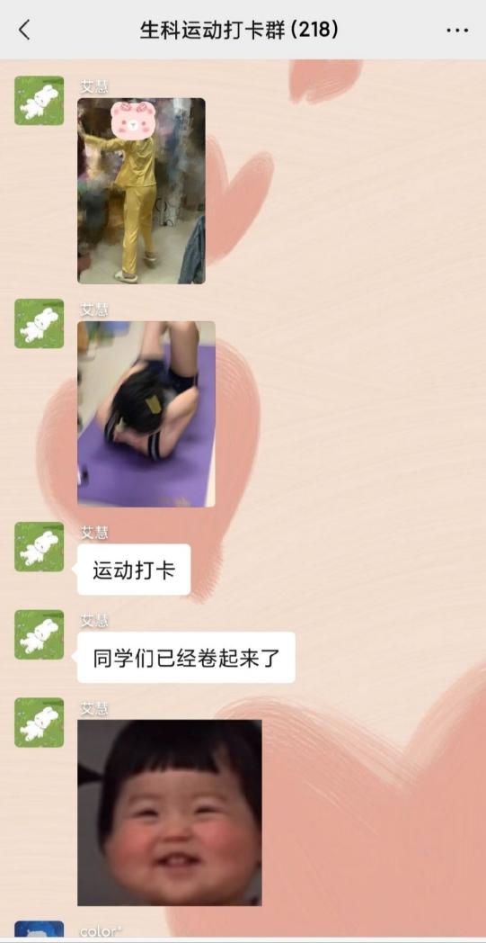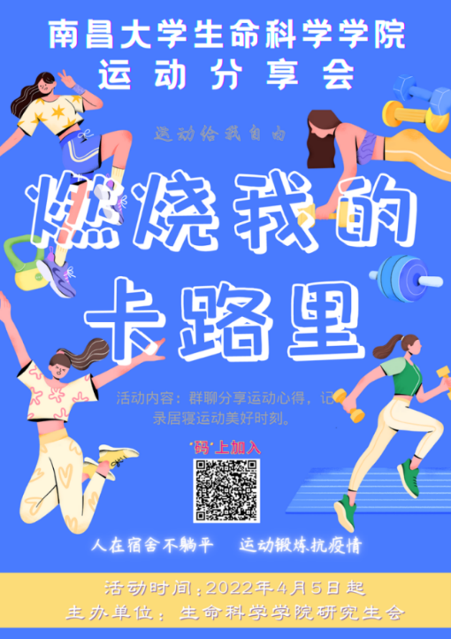 4月5日,学院以“人在宿舍不躺平,运动锻炼抗疫情”为口号,开展了宿舍健身打卡活动。本次活动倡导同学们不组织不聚集,在宿舍进行便捷的健身活动,包括瑜伽、健身操、平板支撑、跳绳、俯卧撑、仰卧起坐、等多项简单易操作的运动项目,并上传当日运动照片、小视频、运动数据截图等至生命科学学院运动打卡微信群。活动虽在云端,但参与者的体验感却未打折扣,同学们响应号召,踊跃参加,在微信群里分享自己的运动照片,有同学表示:“这种互动式的健身方式,不仅可以督促自己锻炼身体,也给单调的抗疫生活带来了乐趣。” “文明其精神,野蛮其体魄”。体育锻炼是增强体质的最积极、有效的方法之一,同时有利于增强身体机能,提高免疫能力。疫情封校期间,学院多举措、全方面关注学生的身心健康,线上运动分享会给同学们营造了自觉锻炼、主动健身、追求健康的运动氛围,让同学们以更阳光的心理状态、更饱满的精神状态度过特殊时期的校园生活。