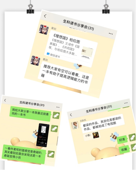 4月5日,学院开展以“宅读书”为主题的线上读书分享活动。“读书分享交流会”线上活动,由研究生会学术部主持筹办,活动通过微信群线上形式进行,大家可以在这里分享自己喜欢的书籍,听完故事之后大家可在群里自由交流,发表自己的心得和感触。活动中,研究生会成员积极参与,将自己最喜欢的书籍分享给大家。每个人都用心讲述着书中的故事,主题鲜明,结合时代旋律,“最美奋斗者”黄文秀、“抗疫”巾帼李兰娟、“生命的卫士”钟南山、默默无闻的志愿者、 “曼巴精神”科比等等,让听众隔着屏幕也能感受到坚定的理想信念和奋斗不息的脚步。活动上最先进行分享的一本书是章圳同学的《理想国》,这部“哲学大全”不仅是柏拉图对自己前此哲学思想的概括和总结,而且是当时各门学科的综合,它探讨了哲学、政治、伦理道德、教育、文艺等等各方面的问题,以理念论为基础,建立了一个系统的理想国家方案。紧随其后同学们热情高涨,开始分享自己最喜欢的书籍,并与其他人一起分享观后感。本次的分享活动不仅充分调动了同学们的积极性,同时也给封闭期间带来乐些许的快乐。让我们越来越多的人学会与一本好书为伴,品味书香,汲取养分,畅游在知识的海洋中。