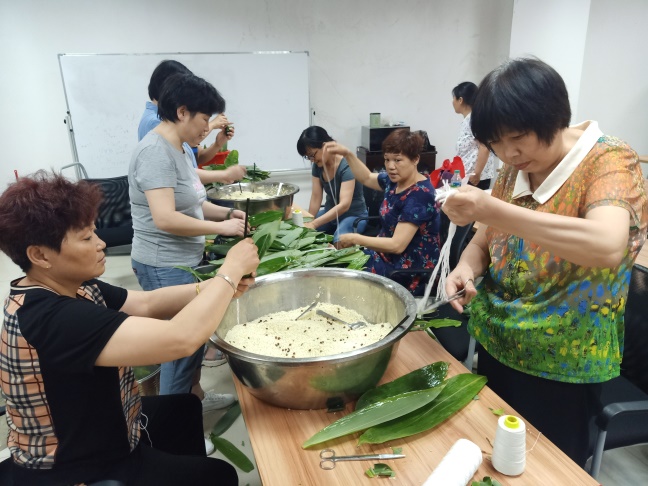 学院工会精心为老师们准备了粽叶、糯米、棉绳等材料。教师们一起动手,你拿粽叶,我来添米,既有独立完成,也有通力合作,并在包粽过程中亲切交流,还不时交流学习党史的心得体会,教学相长,寓教于乐。