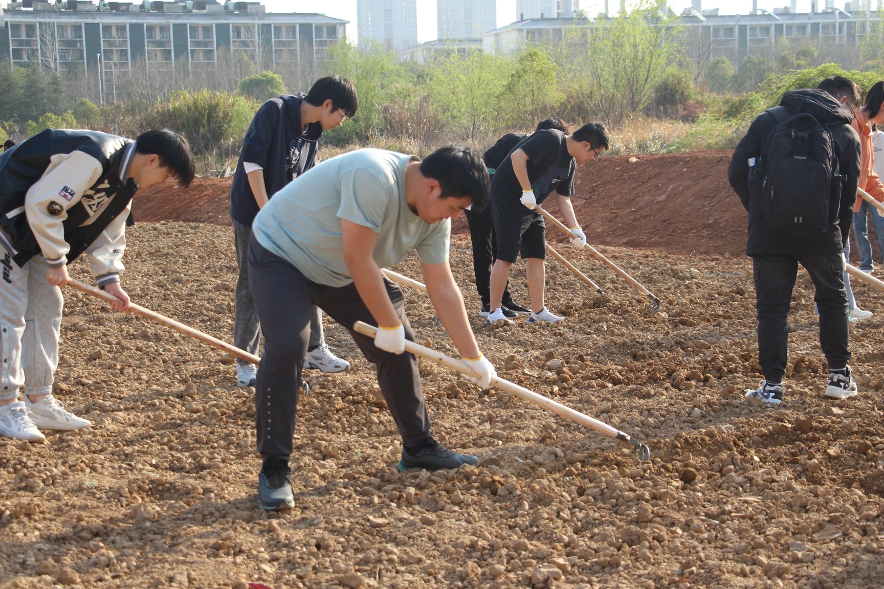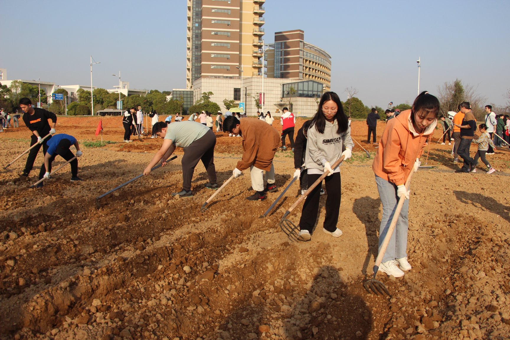 听完杨教授细致的讲解,同学们信心十足,跃跃欲试。大家分工明确,互帮互助,力气大的同学负责锄地打碎土块,细心的同学提着肥料均匀地洒满锄过的土地,虽头顶烈日,汗流浃背,但同学们都沉浸其中,毫不言累。经过一个下午的努力,土地焕然一新。
