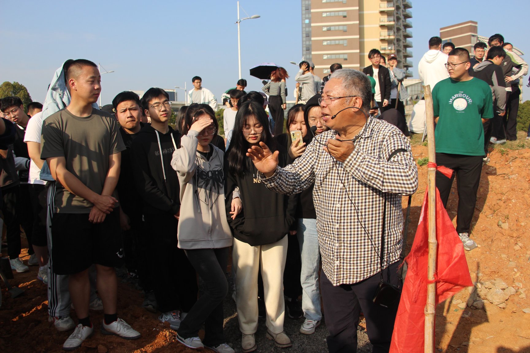 劳动开始前,杨教授向同学们进行了详细的讲解。“翻地时必须把板结的土块敲碎打细,洒下肥料后再把土壤混匀、耙平……”杨教授一边向同学们讲解,一边拿起锄头演示,同学们围成一圈认真听讲,细心的同学向杨教授提出自己的疑问,杨教授也耐心地作出解释。