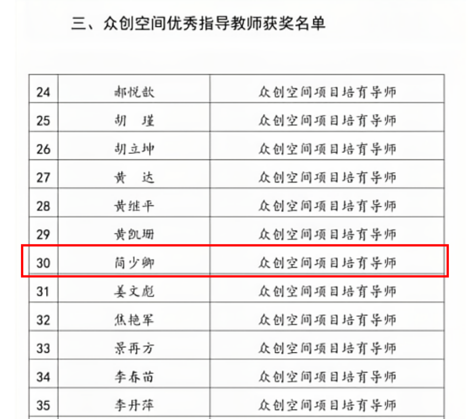 中国高校众创空间联盟是由教育部支持成立,汇聚北大、清华等52所主席团高校及351所会员单位,致力于优化创业资源配置。近日该联盟公布2025年度评选结果,我院简少卿教师荣获"优秀指导教师"称号,实现我院该项荣誉零的突破。
