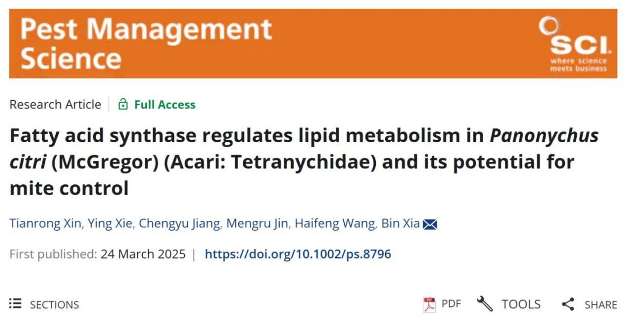 近日,生物灾害与安全团队在昆虫学领域权威学术期刊《Pest Mangement Science》(农林科学中科院一区TOP)发表了题为“Fatty acid synthase regulates lipid metabolism in Panonychus citri (McGregor) (Acari: Tetranychidae) and its potential for mite control”的研究成果,首次揭示了脂肪酸合酶在柑橘全爪螨雌成螨脂肪酸代谢、生存和繁殖中的关键功能。