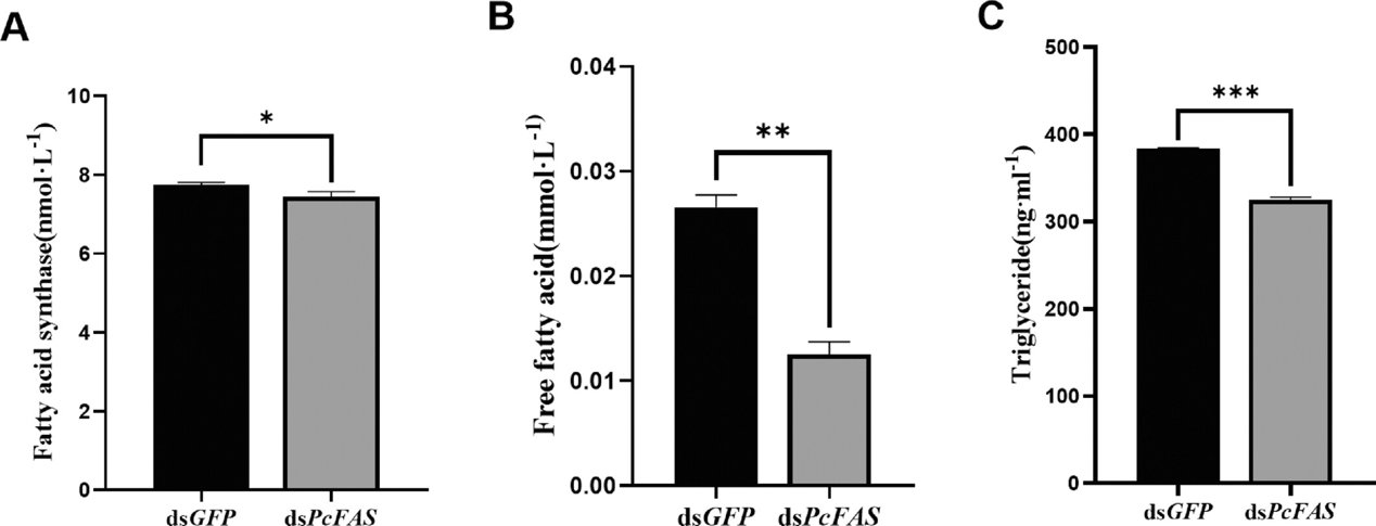 研究发现,RNAi介导的雌成螨PcFAS基因敲除导致柑橘全爪螨在生长发育过程中出现致死表型。此外,PcFAS基因沉默处理48h后,雌成螨存活率显著降低。同时,PcFAS敲除显著抑制了该基因的相对表达水平。同时,柑橘全爪螨的平均产卵量较对照组显著降低。虽然处理组的卵孵化率和雌成螨寿命也低于对照组,但差异未达到统计学显著水平。通过定量分析发现,与dsGFP对照组相比,饲喂dsPcFAS 48h后,柑橘全爪螨体内FAS、游离脂肪酸及甘油三酯的相对含量分别显著降低。这些结果表明,沉默PcFAS基因对柑橘全爪螨的脂质合成具有显著抑制作用。