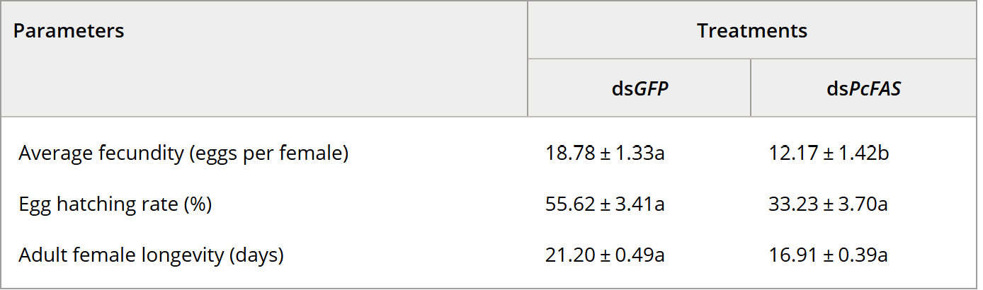 表为dsPcFAS对柑橘全爪螨雌成螨繁殖能力的影响