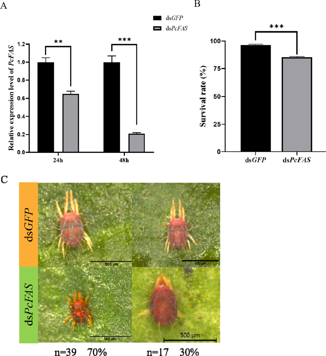 图为PcFAS基因沉默后对柑橘全爪螨雌成螨的影响:(A)PcFAS相对表达水平,(B)存活率,(C)表型特征。
