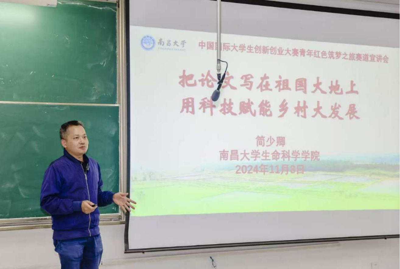 2024 年 11 月 8 日晚 19:00,我院承办的创新大赛(2024)分享交流会(红旅赛道)在南昌大学理科生命大楼 B101教室召开。学院教学分管领导王尚洪主持。此次会议邀请中国国际大学生创新大赛(2024)金奖得主“与鲵同行”和“志椒益螨”团队代表以及指导老师简少卿副教授参加。