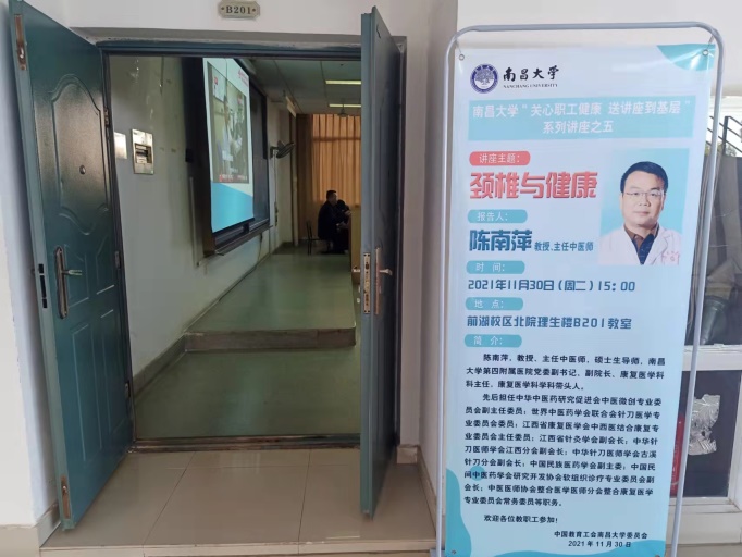 此次讲座邀请到了陈南萍教授、主任中医师,硕士生导师,南昌大学第四附属医院党委副书记、副院长、康复医学科科主任,康复医学科学科带头人做为报告人。陈教授通过播放视频、理论讲解和互动实操,深入浅出地为教职工们分享了有关颈椎与健康方面的知识,赢得了在场老师们的一致好评和热烈反响。