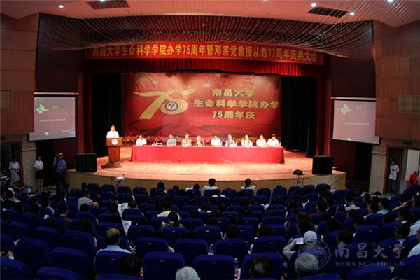 本网讯(记者易有斌、何俊、刘艺文)“风雨兼程七十五载,桃李芳菲遍布九州”。10月2日上午,南昌大学生命科学学院办学75周年暨邓宗觉教授从教77周年庆祝活动在音乐厅举行。学校终身教授、百岁老人邓宗觉先生,副校长朱友林,原江西大学(南昌大学)生物系正、副主任,学院领导、离退休老教师代表、来自省内外16个生物系校友分会负责人和校友代表、教职工及学生代表共计500余人参加典礼活动。