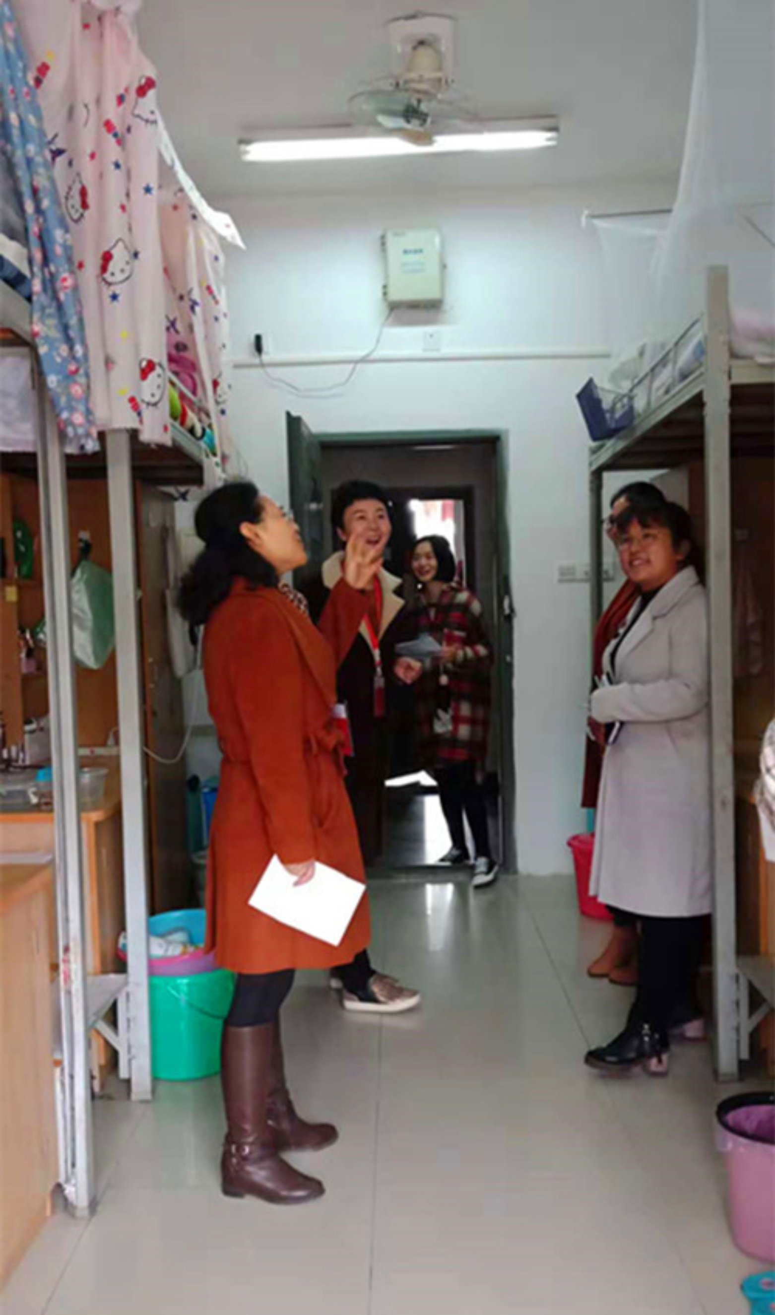 谢书记、万院长及王老师带领我院研究生会学生干部对研究生各个寝室进行了针对性、目的性地安全卫生大检查。 老师们对寝室安全用电、充电器的摆放及饮水机的使用一再叮咛,敦促学生们有一个良好的安全用电意识,消除室内用电隐患,构建一个安全舒适的寝室环境。对待安全卫生检查老师们严肃认真,对待同学老师们像亲人般嘘寒问暖,再三叮嘱大家安全无小事!