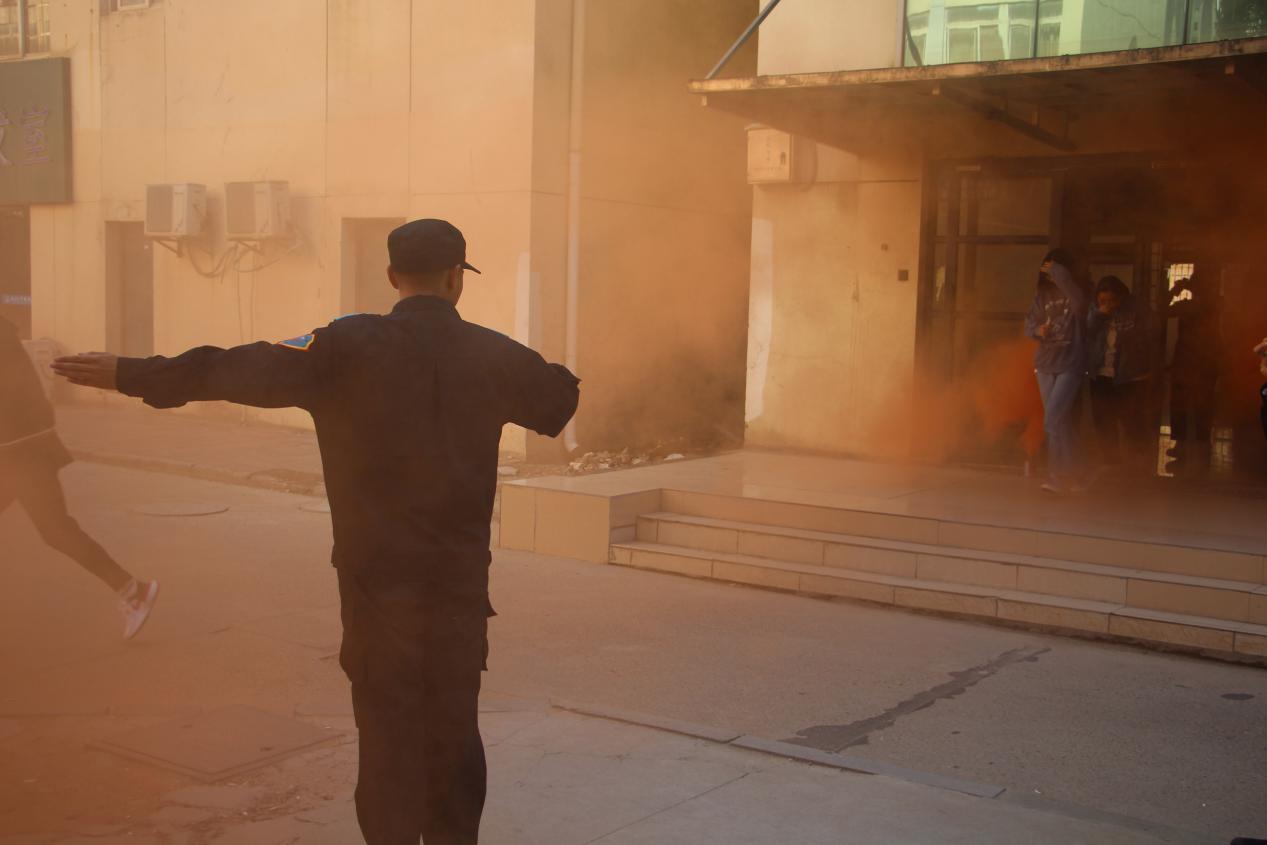 伴随着警报声的响起,全体师生迅速进入紧急疏散状态。大家用衣物捂好口鼻,按照逃生演练方案设定的路线,低身穿过烟雾,迅速而有序地撤出寝室楼栋,并在工作人员的指引下安全转移至安全指定地点,整个过程高效有序。