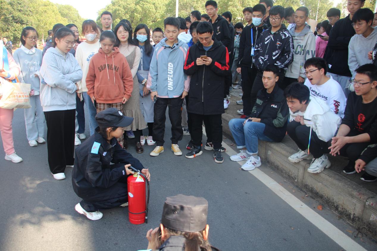 所有同学顺利撤出后,分成不同小组学习灭火器的使用方法。来自南昌大学119义务消防连的同学们向大家讲解灭火器的整体构造、使用方法和注意事项,并将使用方法总结为“提、拔、握、压、扫”五个字,带领同学们一起进入了油盆灭火实战演练。