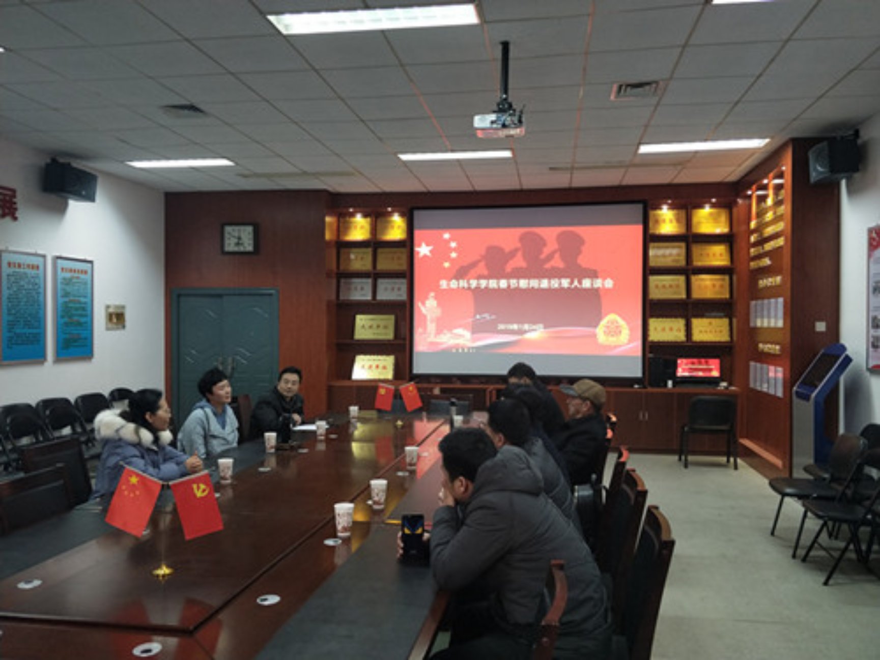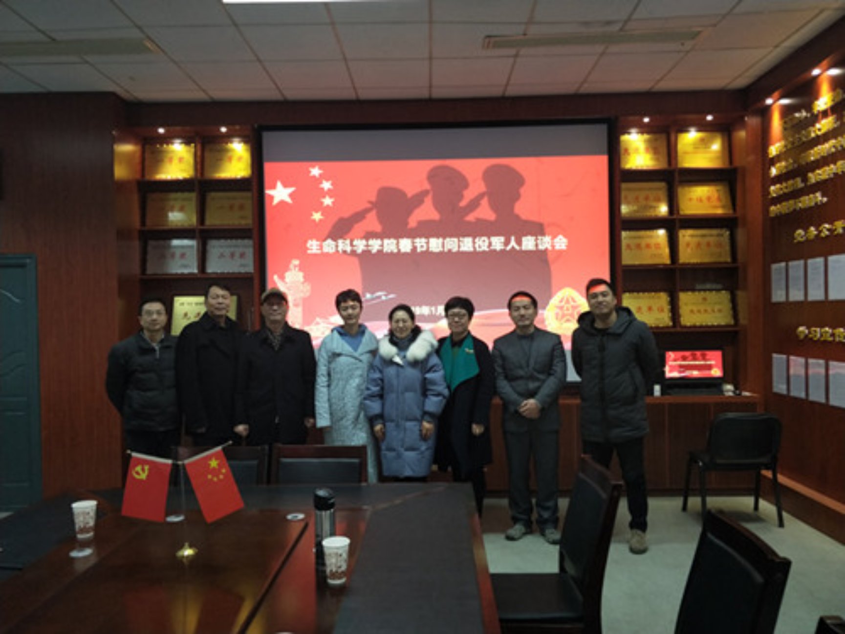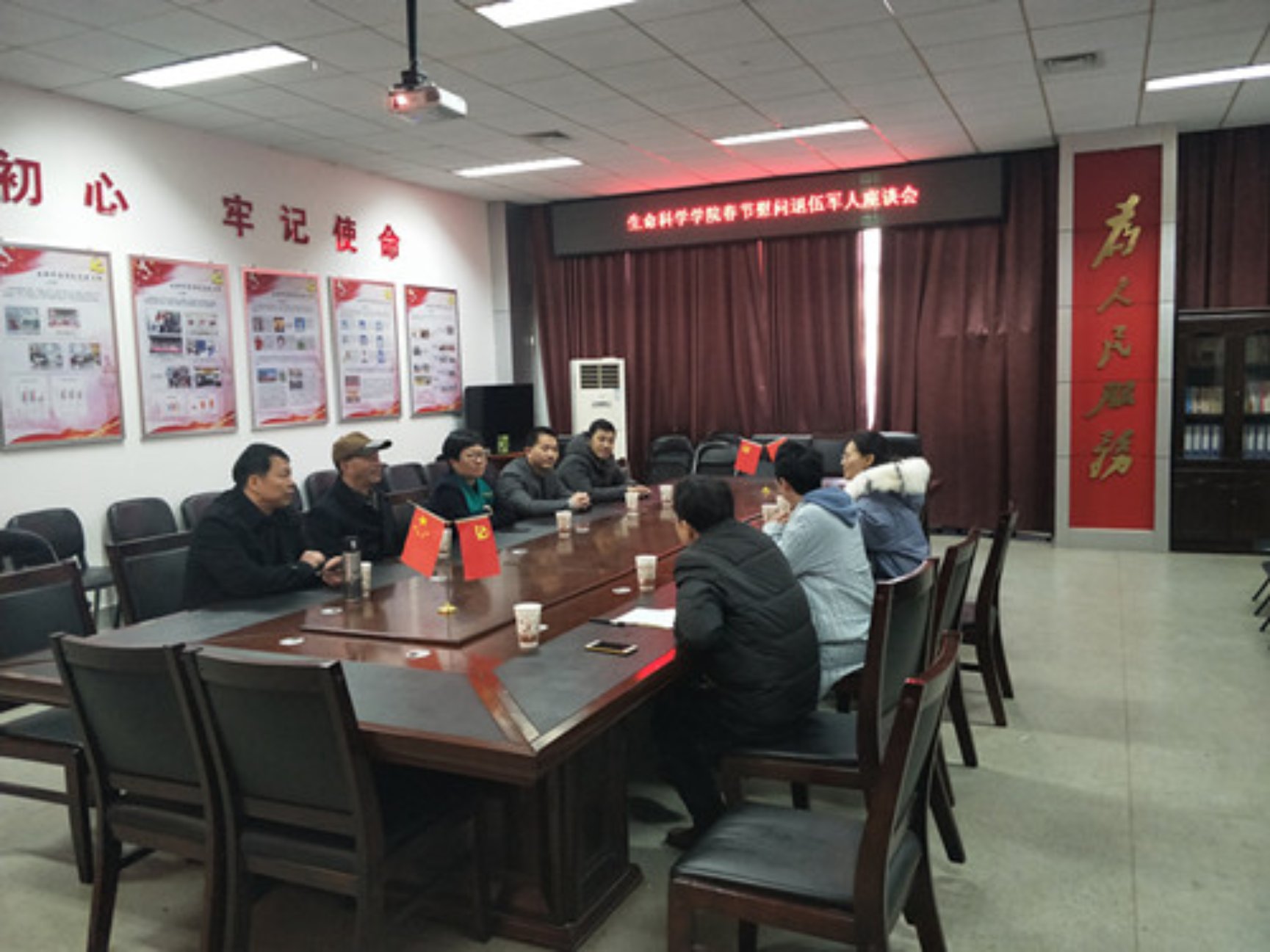 (生命科学学院党政办 刘正东)2019年1月24日10时30分,根据学校《关于做好春节期间退役军人和其他优抚对象走访慰问工作的通知》相关要求,生命科学学院在理生楼B102召开了春节慰问退役军人座谈会。学院党委书记谢春华、行政副院长万丽丽、工会主席夏斌以及全体在职的退役军人教职工参加了此次座谈。