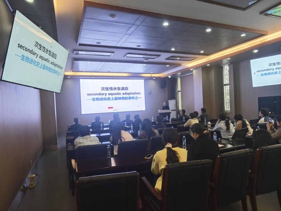 杨光教授在进化生物学与水生适应研究领域具有深厚的学术积累。报告中,他围绕“次生性水生适应”这一主题,系统阐述了海洋哺乳动物作为研究水生适应过程的理想模型,从体型结构、运动方式、食性转变、体温调节、渗透平衡等多个方面,深入剖析了生物从陆生再次返回水生的进化机制与驱动因素。